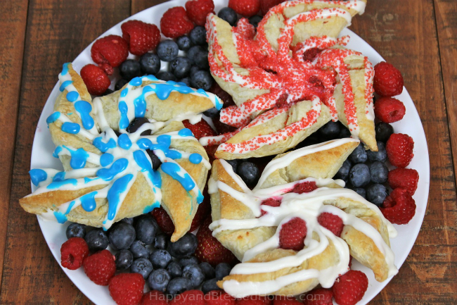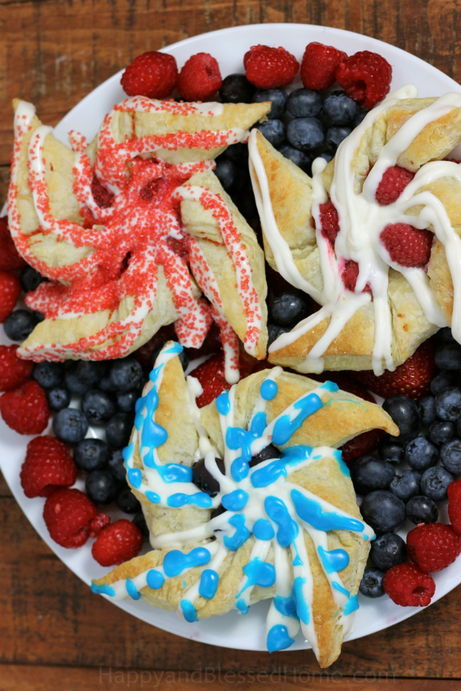 I love the vibrant colors of the berries against the flaky white crust of the puff pastry. Just for fun, I decided to also create some 4th of July Fireworks inspired puff pastries as well. Here is my attempt at creating a “fireworks”display – please let me know what you think in the comments!