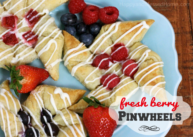- Place your pinwheel pastries into the oven (pre-heated to 400 degrees) to bake for 6 minutes. You will add your berries of choice halfway through baking. I like to use strawberries, blueberries and raspberries.