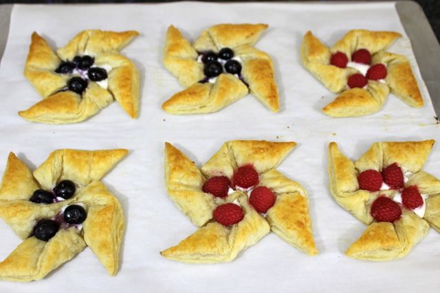Step 9: Place your pinwheel pastries into the oven (pre-heated to 400 degrees) to bake for 6 minutes. You will add your berries of choice halfway through baking. I like to use strawberries, blueberries and raspberries.