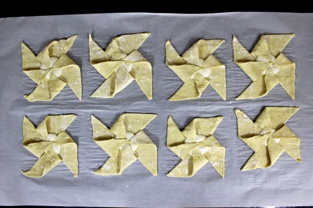 - Tuck the left corner of each triangular piece towards the center creating a pinwheel shape from the puff pastry. Keeping tucking corners until all four corners for each pastry have been pulled to the center.
