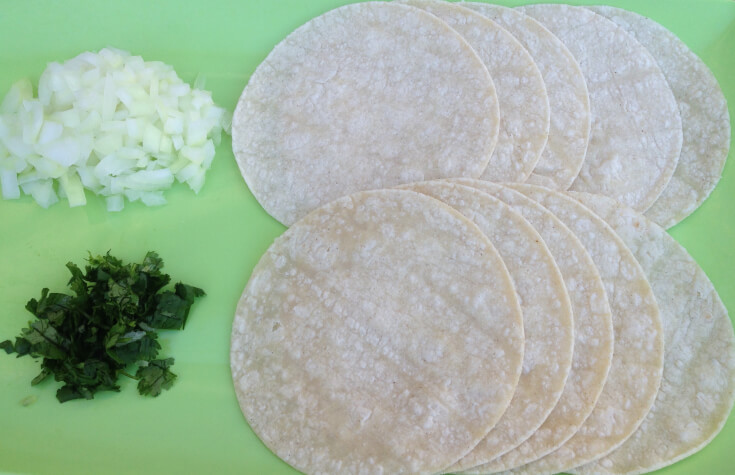Step 4: Warm your corn tortillas and prepare your toppings of choice. My favorite toppings are simple: cilantro and onions.