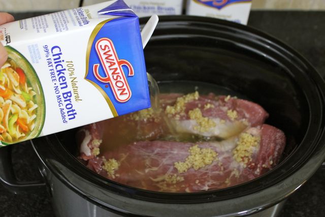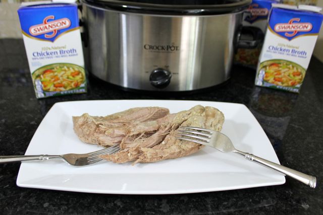 Step 1: Place your two pork tenderloin pieces in the bottom of the crock pot. sprinkle on the salt and garlic. Pour one box of chicken broth over the meat and seasoning. Cover your crock pot and set the temperature to low. Close the cooker with the lid to seal it. This particular slow cooker has latches on the side for securing the lid to the pot – do not make an air tight seal with the latches. The latches are only for securing the lid when you are carrying food in the slow cooker. Set a timer for four hours. When the timer goes off, check the meat for done-ness.