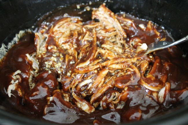 Step 2: Once the meat is pull-apart ready, use two forks to shred the meat. Pile it high on a plate near the slow cooker.