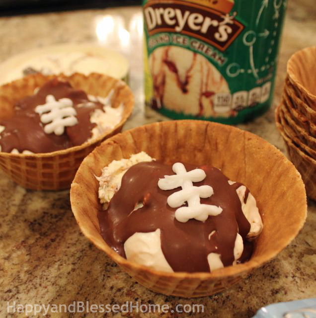I turned our football party dessert, a Limited Edition Dreyer’s Grand Ice Cream in the Touchdown Sundae flavor, into the perfect football party food by transforming each ice cream serving into a football!