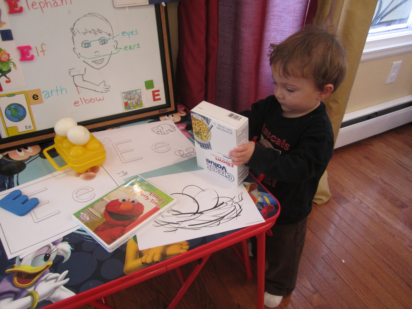 Again, using magnets I wrote down some words including elephant, elf, and earth. The last two words were new to our little man.