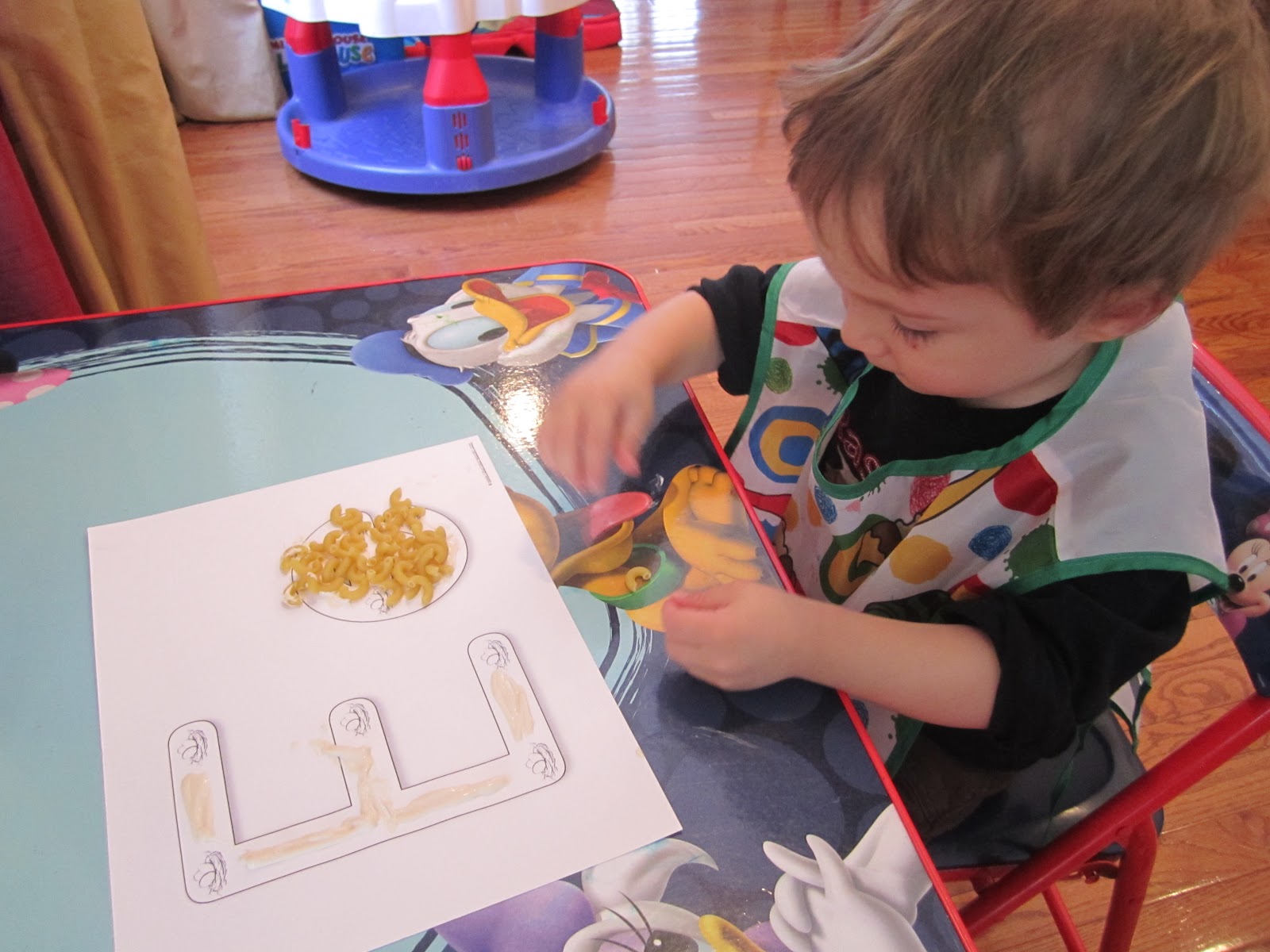Then I had a brainstorm, why not do a craft with the elbow-shaped pasta? So I got some glue and we made the letter “E” using pasta and glue. It was a little messy but well worth it. You can download these free printables from 1plus1plus1equals1.com