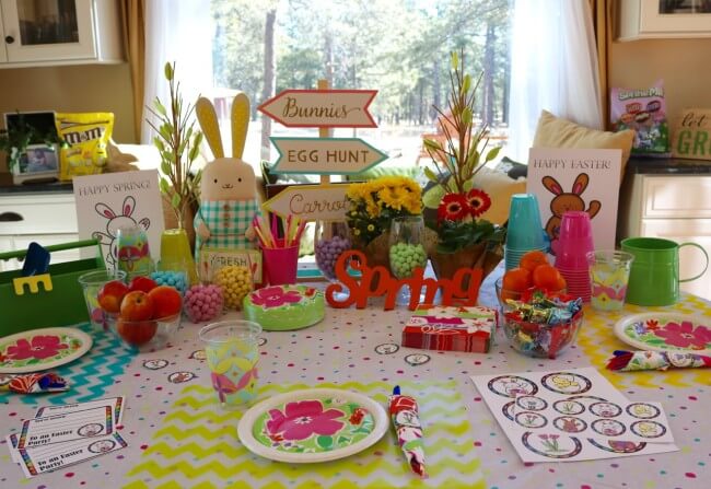 You might also notice the Easter Party decorations in these photos that you can download as a part of this post. They include an Easter party banner, napkin ring holders, table scatter, cup labels and cupcake toppers, signage and Easter activities for kids.