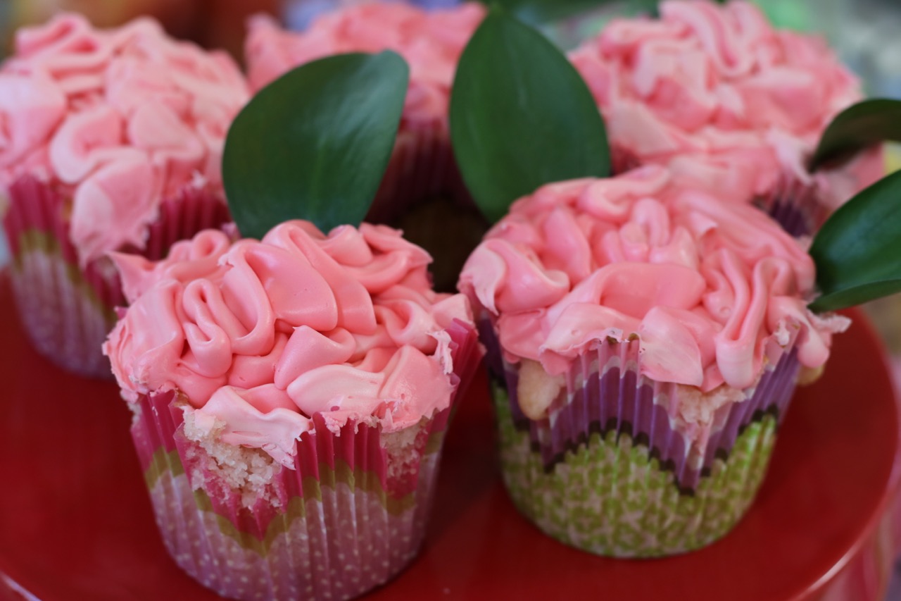 I love the fresh colors of spring! The pinks, greens, yellows, and blues. These Pink Champagne Cupcakes are not only aromatically pleasing, they taste like sweet champagne. I’m still working on my frosting techniques, but I’ll call this a pink crinkle flower. I used two different pink colors packed into the same icing bag and a Wilton’s #104 Flower Petal Tip.