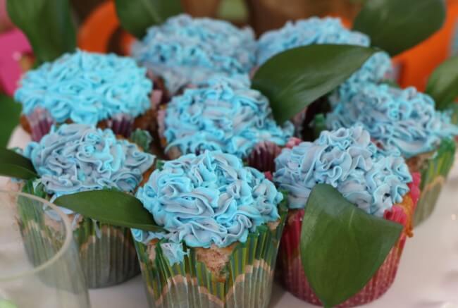 Of course, I also had to make some hydrangea cupcakes, so I used two different blue frosting colors and a Wilton’s #224 frosting trip for creating Drop Flowers.