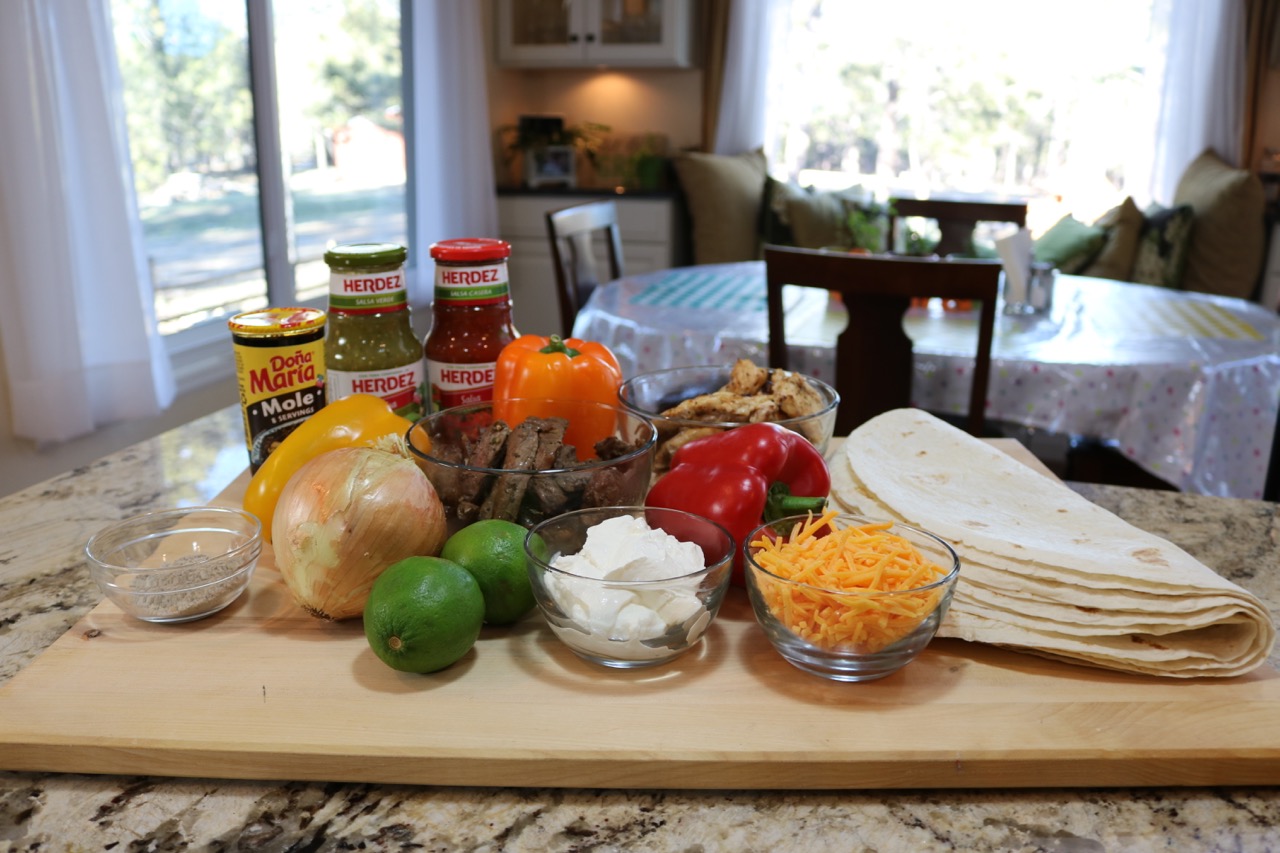 Step 1: Wash and prepare all the produce. Shred the lettuce and cut the tomatoes into halves or fourths. Cut the bell peppers and onions into strips. Set aside in separate bowls or containers. Once complete, cut the steak and the chicken into strips – approx. 3 inches long by about 1 – 1/2 inches wide.