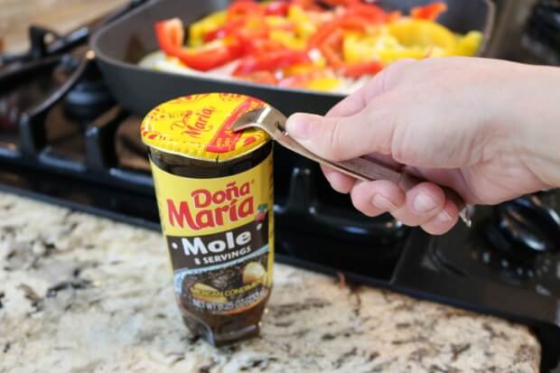Step 3: Grill the bell peppers and onions. Prepare the pan first by heating up one to two tablespoons of the butter and using it to liberally coat the pan. Lay your vegetables into the pan on the hot butter and simmer, flipping throughout the cooking cycle (8-10 minutes). Open the Doña María Mole and create a “sauce” from the contents by adding 1/4 cup of water to one tablespoon of Doña María Mole (condensed). Microwave the mixture on high for 30-60 seconds and stir until liquid. Reheat or add more water if needed.