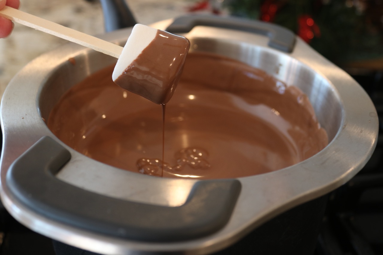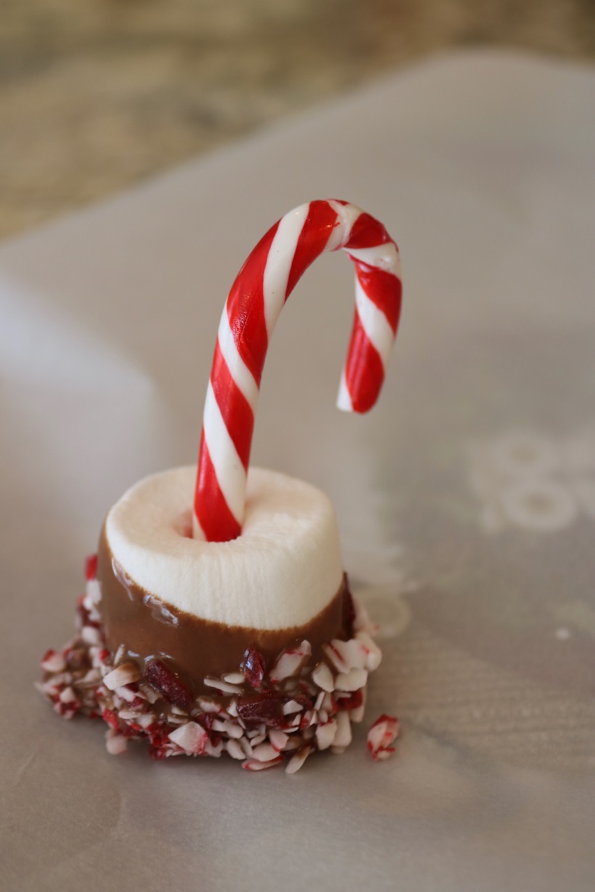 Step 4: Dip the marshmallow into the chocolate. Insert a popsicle stick into the marshmallow and use the popsicle stick to dip the marshmallow into the melted chocolate. You could use the candy cane, but I wanted to make sure I did not break any of the candy canes, which is why I used the popsicle stick first. You can dip the marshmallow into the chocolate as deeply as you would like it coated – it’s entirely up to you.