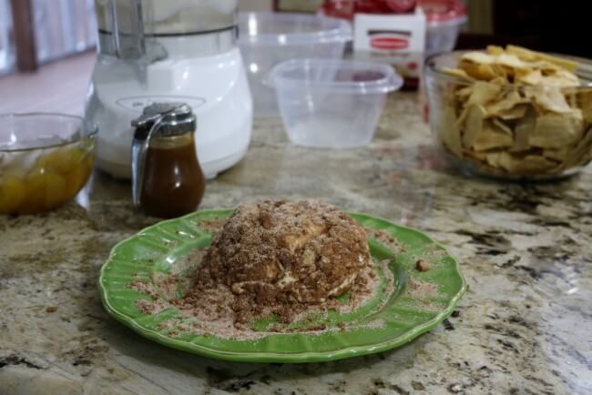 Step 4: Create a cream cheese ball. I used a spatula to dump the cream cheese out of the food processor and into the center of the lasagna dish with the topping. Using the parchment paper, roll your cream cheese in the nuts and cinnamon and sugar mix until completely coated. If it’s too soft, place it in the freezer for 1/2 an hour to help it firm up a bit. Once the ball is rolled, you can dump the entire thing upside down on a plate in the center, and use the parchment paper or your hands to gently press the cream cheese cinnamon sugar coated mix into a ball. You can clean off any excess cinnamon sugar mix with dry paper towels. Add some caramel sauce if desired on top of your rolled ball. Caramel sauce is optional.