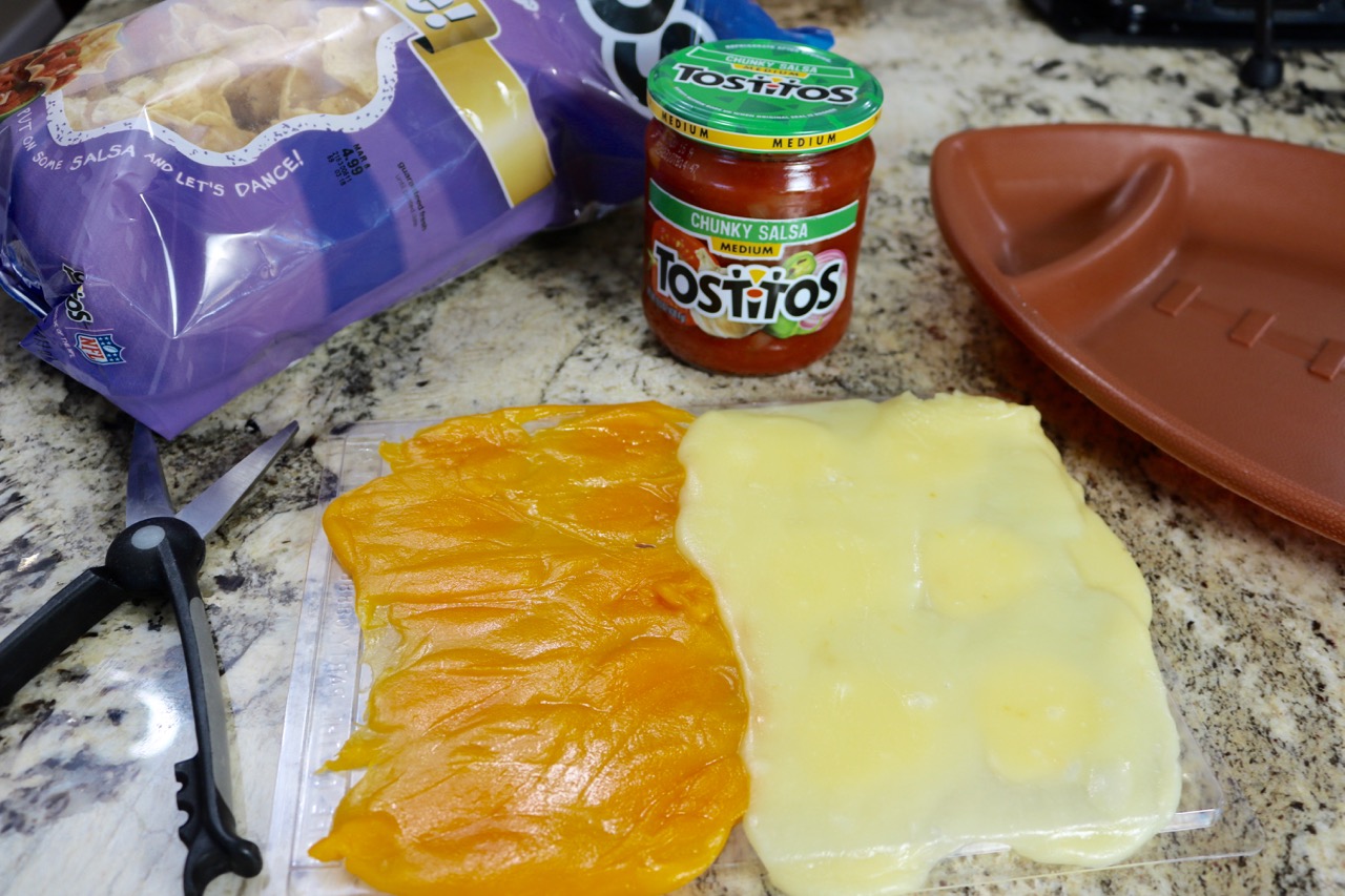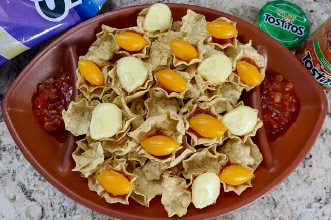 I found this FUN football tray at Walmart and served the chips, salsa and cheese like this:
