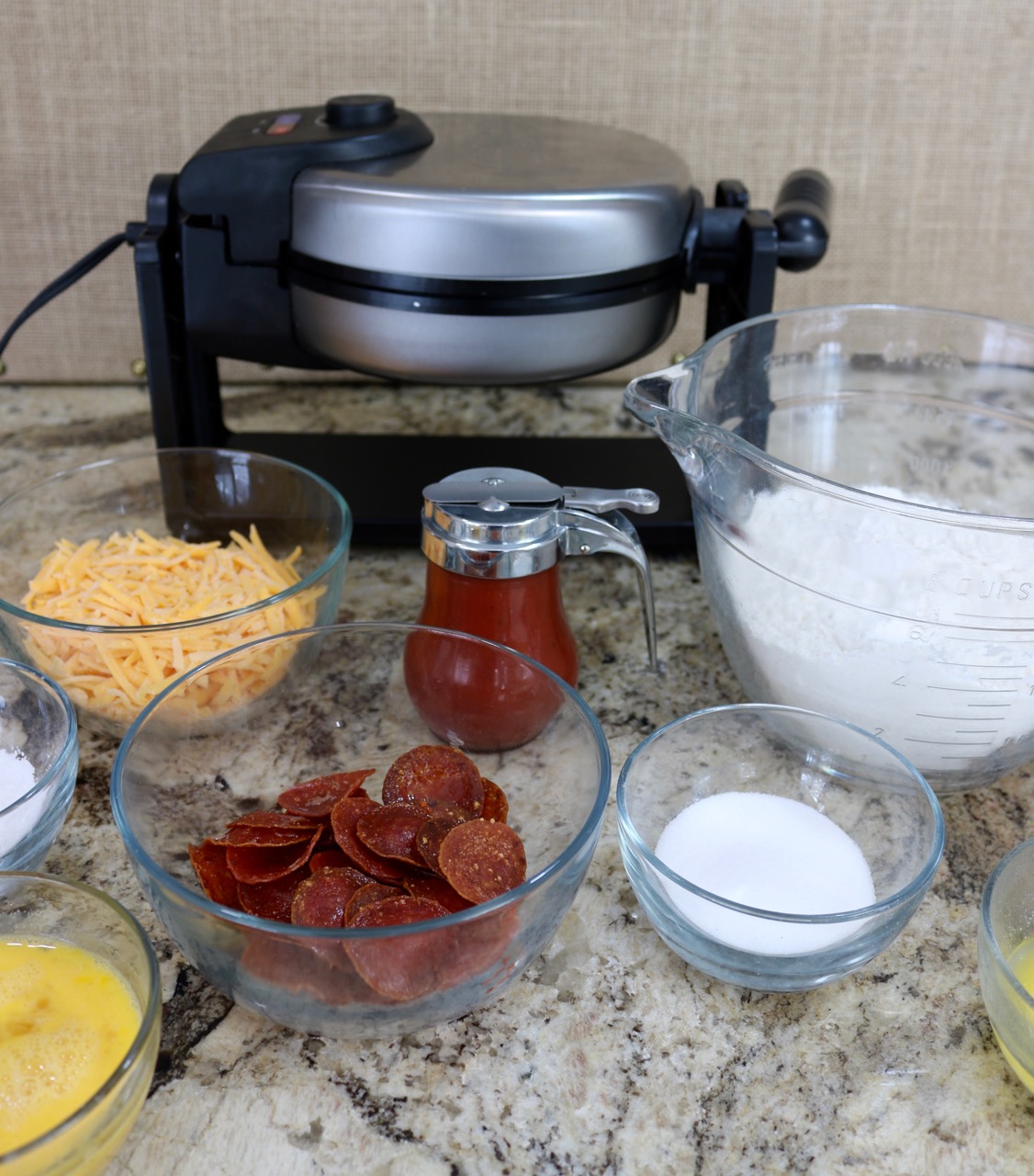 Step 5: Add your toppings to create Waffle Pizza. I topped our Waffle Pizza with marinara sauce, pepperoni and cheese. I precooked the pepperonis in a pan to make sure they were crispy (the way our family likes them). You can customize the pizza any way you like. Try Hawaiian style, or three-cheese, or meat-lovers. With all the little pockets there’s room for loads of veggies, meats and cheeses.