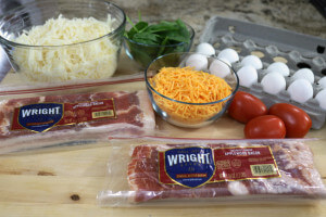 Ingredients to make Hash browns, Eggs and Bacon Breakfast Casserole