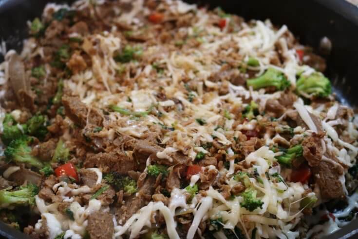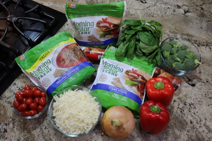 Step 6: Add a bag of MorningStar Farms® Steak Strips and the garlic salt, stir to combine. Cover and cook for six to eight minutes or until the steak strips are completely defrosted. Stir every one to two minutes. The steak strips will cut with a spatula – that’s how you’ll know it’s ready.