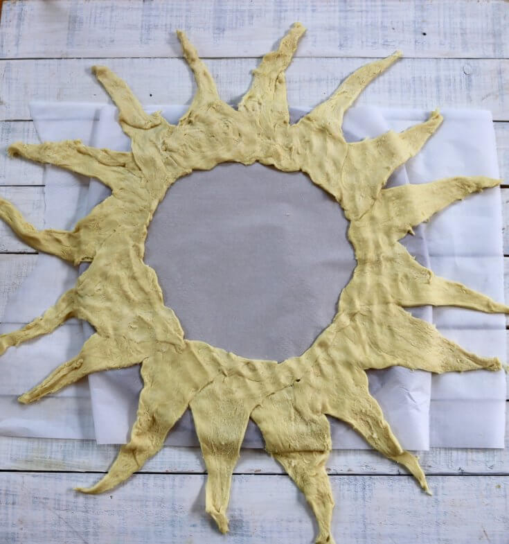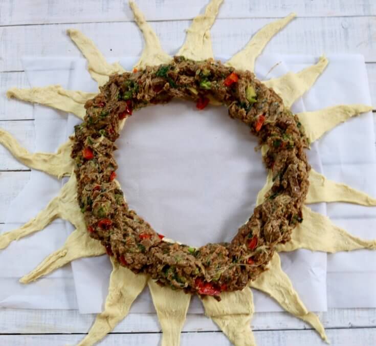 Step 8: Take a pizza stone and lay a sheet of parchment paper over it. Open the crescent rolls and separate them into triangles. Overlapping the widest part of the triangle, make a circle like a sun around the outer edge of the pizza stone. Use your hands to create a platform for the filling by pressing the crescent rolls together at the inner ends. The outermost part of the triangle will extend outward from the center creating the appearance of a giant star.