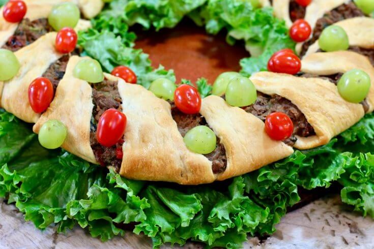 Step 12: Decorate. I cut toothpicks and large green grapes in half to decorate the Christmas Wreath Crescent Ring. I also used grape tomatoes. I used 20 of each. I layered the tish with green leaf lettuce to create an edible Christmas Wreath – perfect for holiday entertaining!