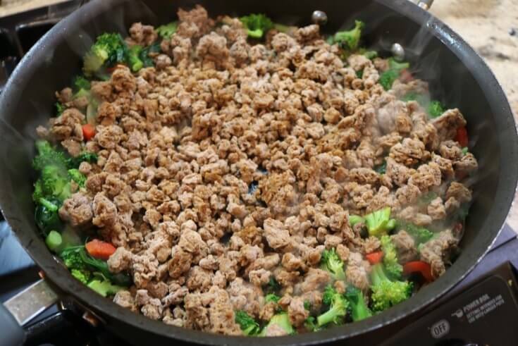 Step 5: Push veggies to the side and drop one to two pats of butter into the center of the pan. Pour one bag of MorningStar Farms® Grillers® Crumbles™ into the pan. You do not need to defrost. These crumbles contain 75% less fat than regular ground beef, and have 9 grams of protein. You can go straight from frozen.