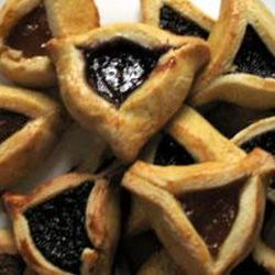 On Purim, triangular pastries called (“Haman’s pockets”) are served. A sweet pastry dough is rolled out, cut into circles, and traditionally filled with prune or mun, a sweet poppy seed filling, then wrapped up into a triangular shape with the filling either hidden or showing.”