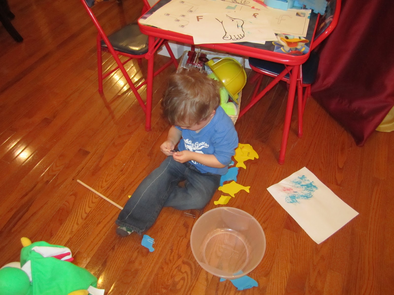 Firetrucks, a stuffed frog, and a fire chief hat filled the sensory basket, and mommy posted flash-cards with a fox, fish, flower and frog on the magnet board. “Fox” was a new word for Peanut. Also featured here are some great books if you are on the letter “F”: “Hooray for Feet” by Susan Pearson, “Froggy Gets Dressed” by Nathan London, and “Trout, Trout, Trout (a fish chant)” by April Pulley Sayre.