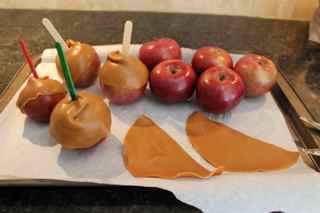 - Wrap apples in caramel, bringing edges together and shaping caramel to fit around the top of the apple.