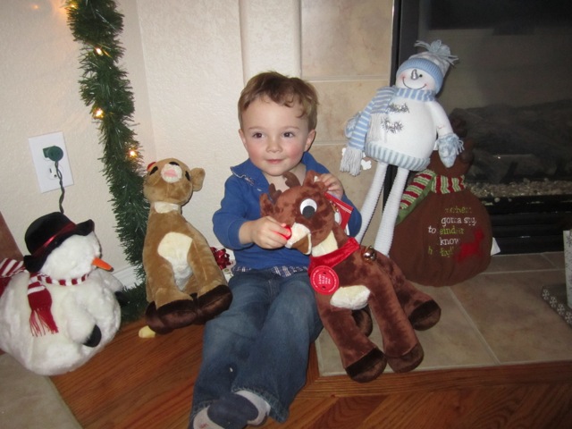 Every year my friend Corrine hosts a Christmas cookie party. This year I had to make 90 cookies for the party. For good measure I made an extra few batches to distribute to family as gifts. Our big boy helped decorate the cookies by adding sprinkles. At the party Corrine was very kind to let Peanut take home one of the stuffed animals she had used to decorate her home, a Build-A-Bear workshop Rudolf the Red-Nosed Reindeer with a light up nose and authentic jingle bell neck harness. He adores his new stuffed toy. Thanks Corrine!