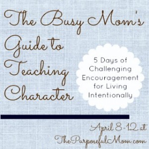1. Jenn at The Purposeful Mom shared a five day series on teaching character to children. My senior pastor says that we need to treat our homes like a “training facility”. We want to train our children in such a way that they are able to thrive when they leave home to make it on their own. I think Jenn’s ideas are a great way to start.