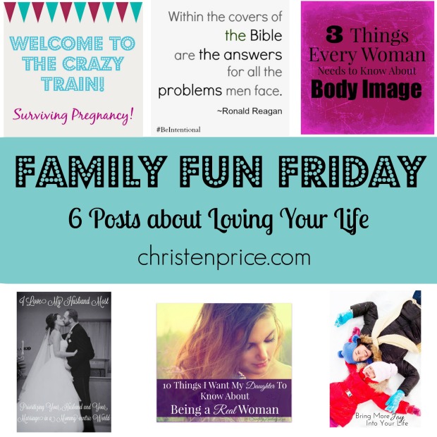 Welcome our newest member to the fabulous co-hosts for Family Fun Friday, Christen Price! Christen blogs at Illuminate and she’s rounded up some encouraging posts for women including 6 posts about how to love your life. Whether you are looking to read the Bible more faithfully, teach important life truths to your daughter, or bring joy in your day to day, Christen has rounded up some great words of inspiration at Illuminate. If you have a minute, please stop by and give her a little bloggy Facebook love!