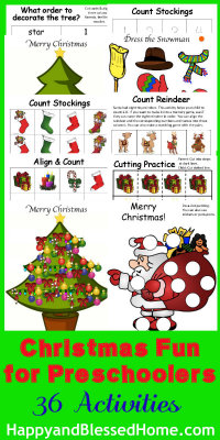 This year I’ve also created a super fun Christmas Fun for Preschoolers Activity Pack. I’m selling it as a way to raise funds to support my blogging. It’s only $1.99 and includes 36 Fun Activities for Preschoolers. You can dress a snowman, decorate a Christmas tree, count reindeer and so much more. Click the link to read more.