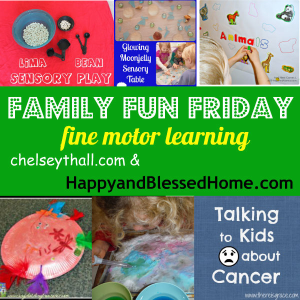 6. While my last pick isn’t really considered a hands-on or sensory learning project, it is a true hand-on life lesson. Nancy at There is Grace is battling cancer right now. In her post, Talking to Kids About Cancer, she talks about ways to practically talk with children about cancer and how she did it with her own children. Nancy says, “We gave our kids tangible things they could do to help the situation. They have made cards for me, brought me drinks and snacks, read me stories, snuggled, and dubbed themselves “nurses” for the day to take care of Mommy when I don’t feel well.” Even if you are not dealing immediately with this ugly disease, you never know when your kids might in someway be affected and Nancy has some good, down to earth and practical advice.