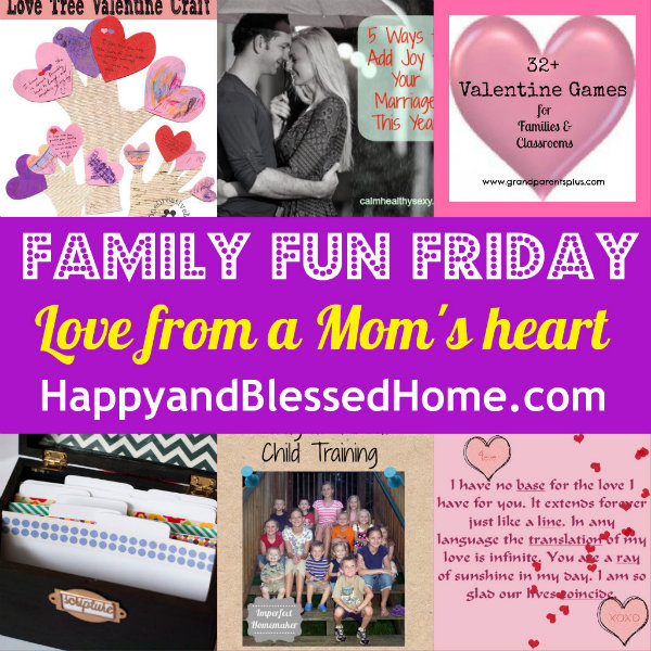 I just love the hearts of the bloggers who gather here at Family Fun Friday! Moms and wives and grandmothers who love their children, husbands, and other family members! I am so encouraged by your posts. There are some wonderful ideas here for sprucing up your marriage, raising up children of character, and lots of fun games and activities you can do together as a family. If you’re a follower of HappyandBlessedHome.com I think these posts will truly be a blessing for you this week!