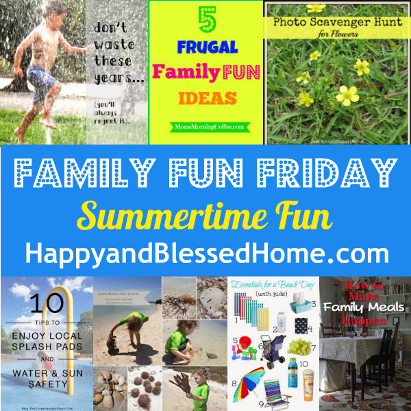 The theme from last week is get outside and get wet! Kids love playing and when the weather is good there are lots of fun things to do. Our Family Fun Friday bloggers shared some wonderful tips for outdoor and summertime fun in their posts last week and I’ve included a list of five frugal ideas, to help you save money, and a post to help you make family meal times happen. Keep coming back every Friday for some fabulous ideas for family fun all summer long!
