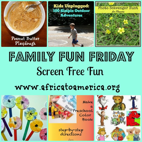 If you were inspired by Summer’s post from Outside Kid (above) then you are going to love Carly’s round-up of screen free fun! Oh course, my boys would devour peanut butter play doh but I gotta check out the list of 100 Simple Outdoor Adventures. If you want creativity and fun Family Fun Friday is the place to be! Special thanks to Carly from Africa to America for rounding up these ideas for Screen Free Fun. If ya’ll have a minute stop by Carly’s Facebook Page and show her a little bloggy love. 🙂