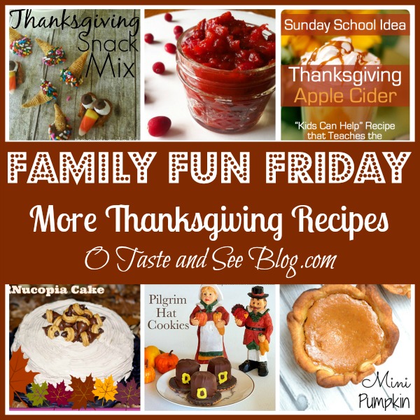Looking for something special to serve your guests this Thanksgiving? Check out these tasty Thanksgiving Day recipes including a yummy Thanksgiving snack mix, homemade cranberry butter, Thanksgiving Apple Cider, Conicopia Cake, Pilgrim Hat Cookies, and mini pumpkin pies. You’ll find it here and at O Taste and See. When you have a minute, let Danita know your favorite recipe, and please show her a little bloggy love on Facebook.