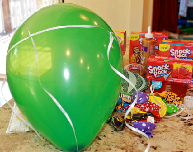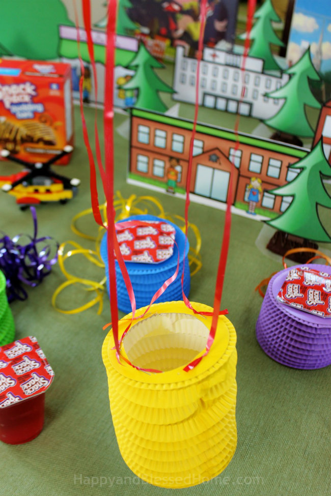 These hot air balloons also make an adorable party snack. I filled the hot air balloon baskets with Snack Pack Juicy Gels and Sour Patch Kids. In the story, “The Amazing Air Ballon”, the baskets were designed only for single passenger flight. So, our hot air balloon baskets carried only a single passenger per balloon.