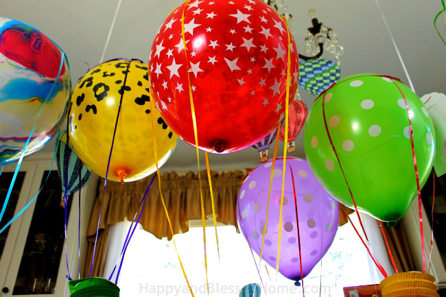 As you can see here. I’ve cut the printables and I’ve used the corners from a cardboard box to set them up to a standing position. I just taped the buildings to the cardboard box corners to stand them up. I hung the hot air ballon cut-outs from the eat-in breakfast area chandelier and from ribbon hung from the ceiling. It created a hot air balloon backdrop for my inflated creations.
