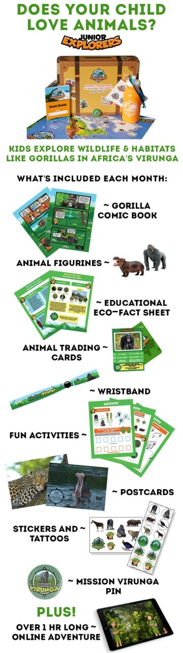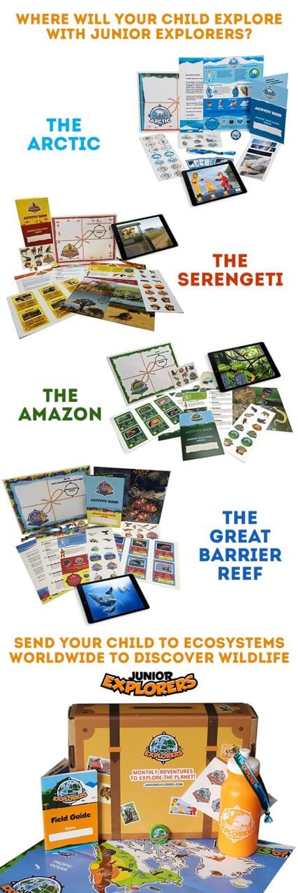 Junior Explorers is a fun and educational monthly subscription program for elementary aged kids, which teaches them all about wildlife and nature! As Junior Explorers, kids go on monthly interactive ‘missions’ to explore different ecosystems and the animals that live there. Each mission includes both tactile and digital components with kits delivered home plus a robust online experience. Kids also learn how to give back and support the habitats and species they explore every month through the Junior Explorers.