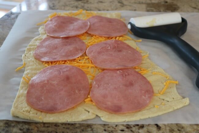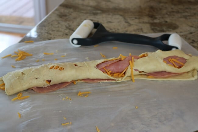 - Roll the dough longways into a Ham and Cheese Roll Up
