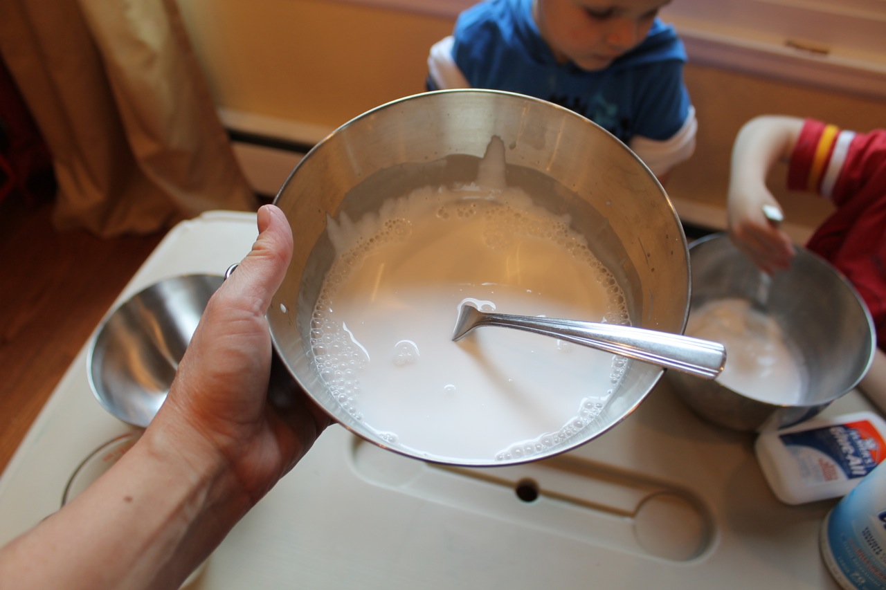Step 3 – Get a large mixing bowl and empty 4 oz. of white school glue into the mixing bowl. My boys love to help me create recipes!