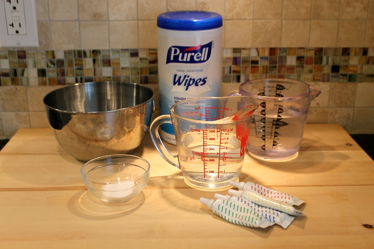 Before Cleaning with PURELL® Hand Sanitizing Wipes our early experiments with my first batch of slime looked like this: