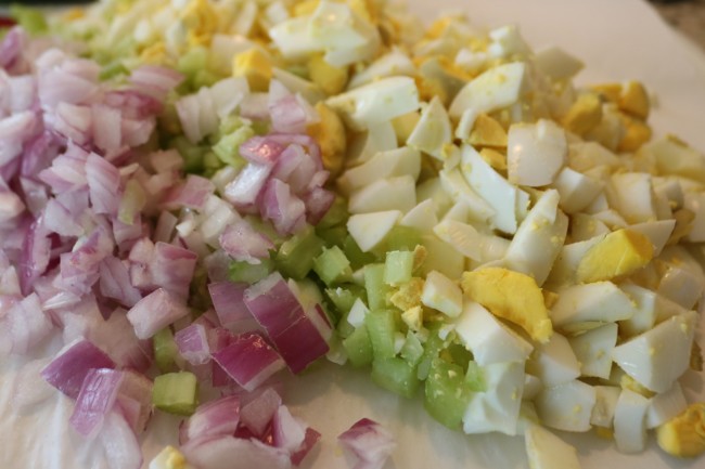 Dice the eggs, celery, and red onion. Mix in a large bowl adding mayonnaise, dill weed, salt and pepper. I used a silicone spatula to mix the egg salad together to keep the egg intact during mixing. Once throughly combined, spread the egg salad mixture 1/2 inch thick onto white bread and serve. For my little guys I cut the crust off and cut the sandwiches into small triangles.