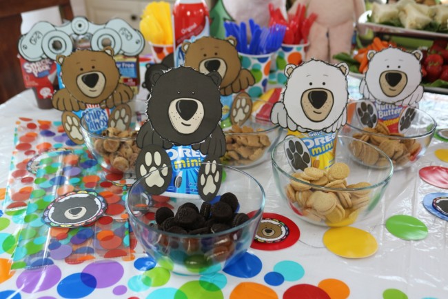You can find everything featured here at Walmart. The rainbow colored party supplies are also at Walmart in the party section. I printed the bear hunt banner and bear-inspird decorations at home. Find more fun recipes online at the Snack Pack Website. You can also shop Walmart Online for your party decorations and party snacks.