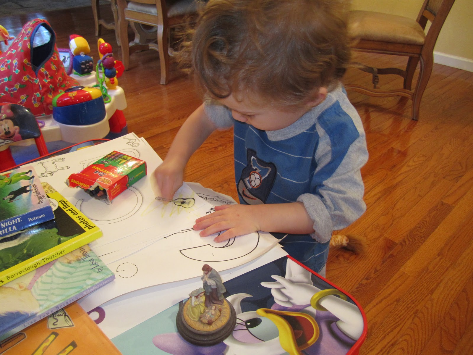The box with baby Jesus inside was fascinating for our little guy. He also enjoyed playing with his phonics sound maker and coloring.