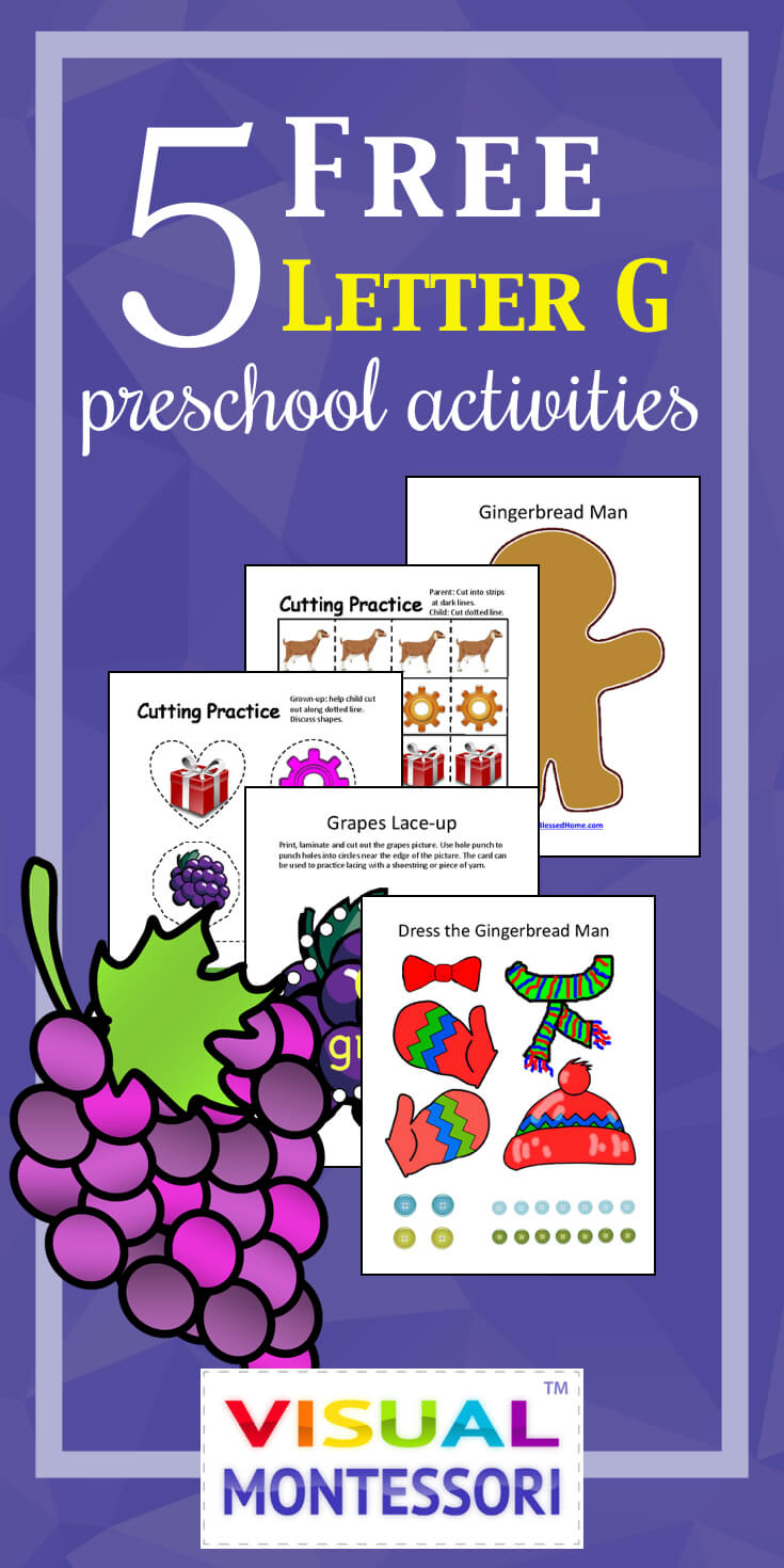 Here I am sharing 5 FREE Preschool Worksheets for Preschool Alphabet Letter G. It’s a sample pack from our family’s preschool at home program, Visual Montessori, based upon the 12 sensitive periods as outlined in Montessori.