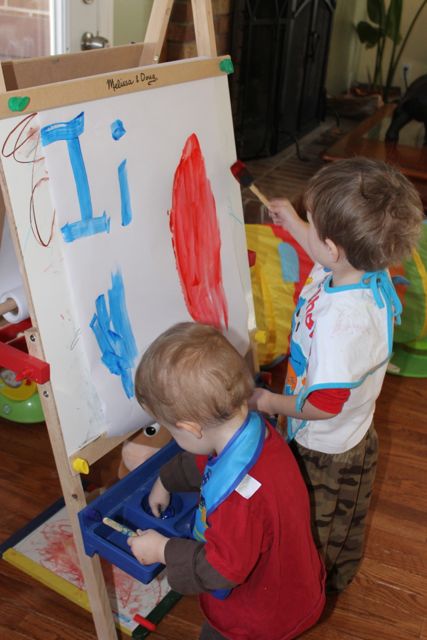 We attempted to paint the letter “I”. The boys are painting on our Melissa & Doug Deluxe Standing Easel. A gift from Nannie.