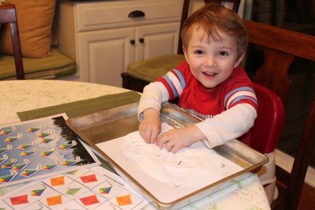 This week we started our letter K study with a sensory exercise. I printed out two of the larger traceable letter “Kk”s from my printable package and placed them in the bottom of some cake pans.  I then poured about 1 cup of sugar over each one and let each of the boys trace the letters through the sugar. They had a blast. My eldest noticed right away and informed me, “Mommy, sugar is kinda sweet.”  Yes it is, and it’s safe which is why I use it instead of colored sand.