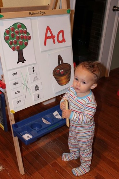 I spent some time on Pinterest looking for things that might be good for our letter A activities this week. I pinned everything that looked interesting. My goal is to create a board for each letter of the alphabet. Follow me on Pinterest if you want to get copied on all the resources and ideas that I discover via Pinterest. My 20-month old is too young for this study – but I thought he made a very cute instructor!