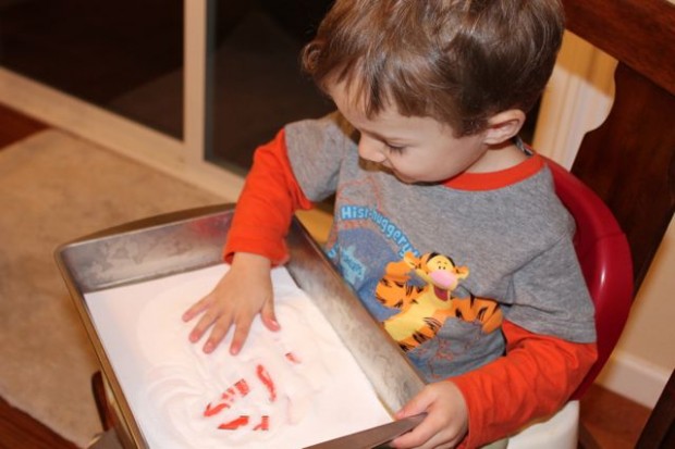 I poured sugar over a the red letter A in a cake pan to create a traceable sensory bin.